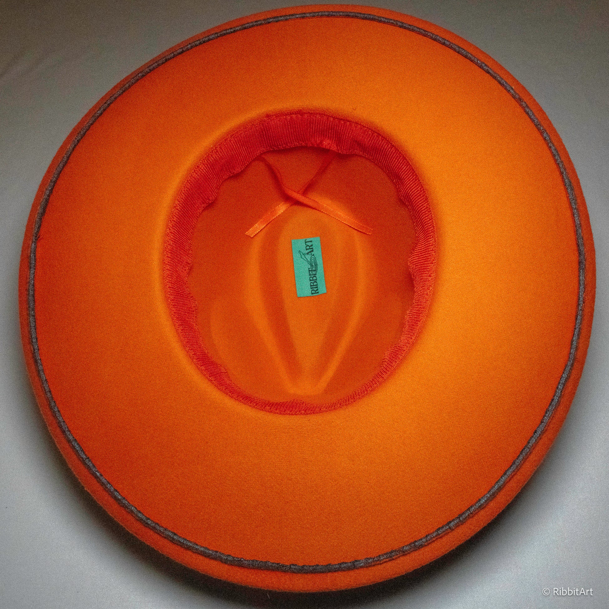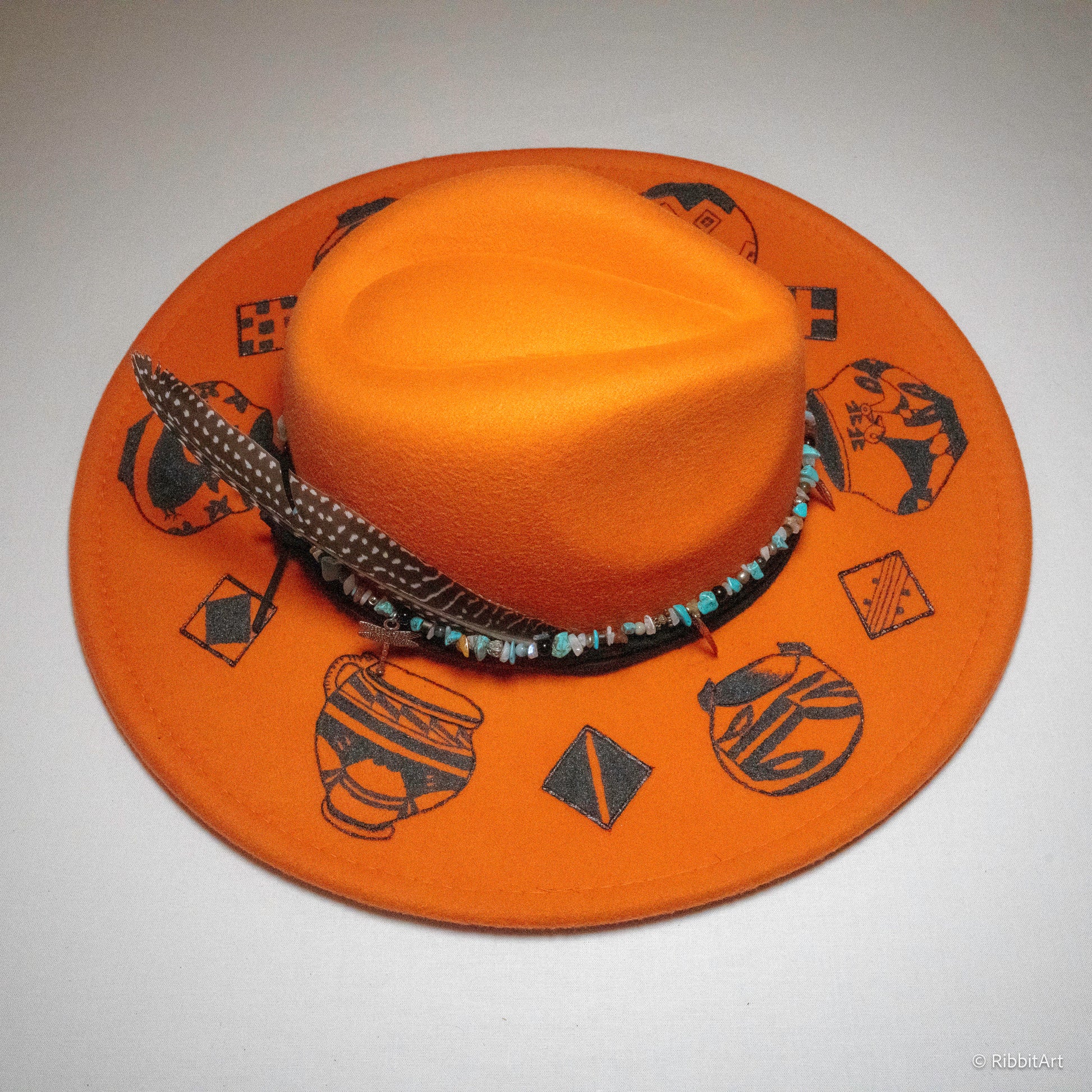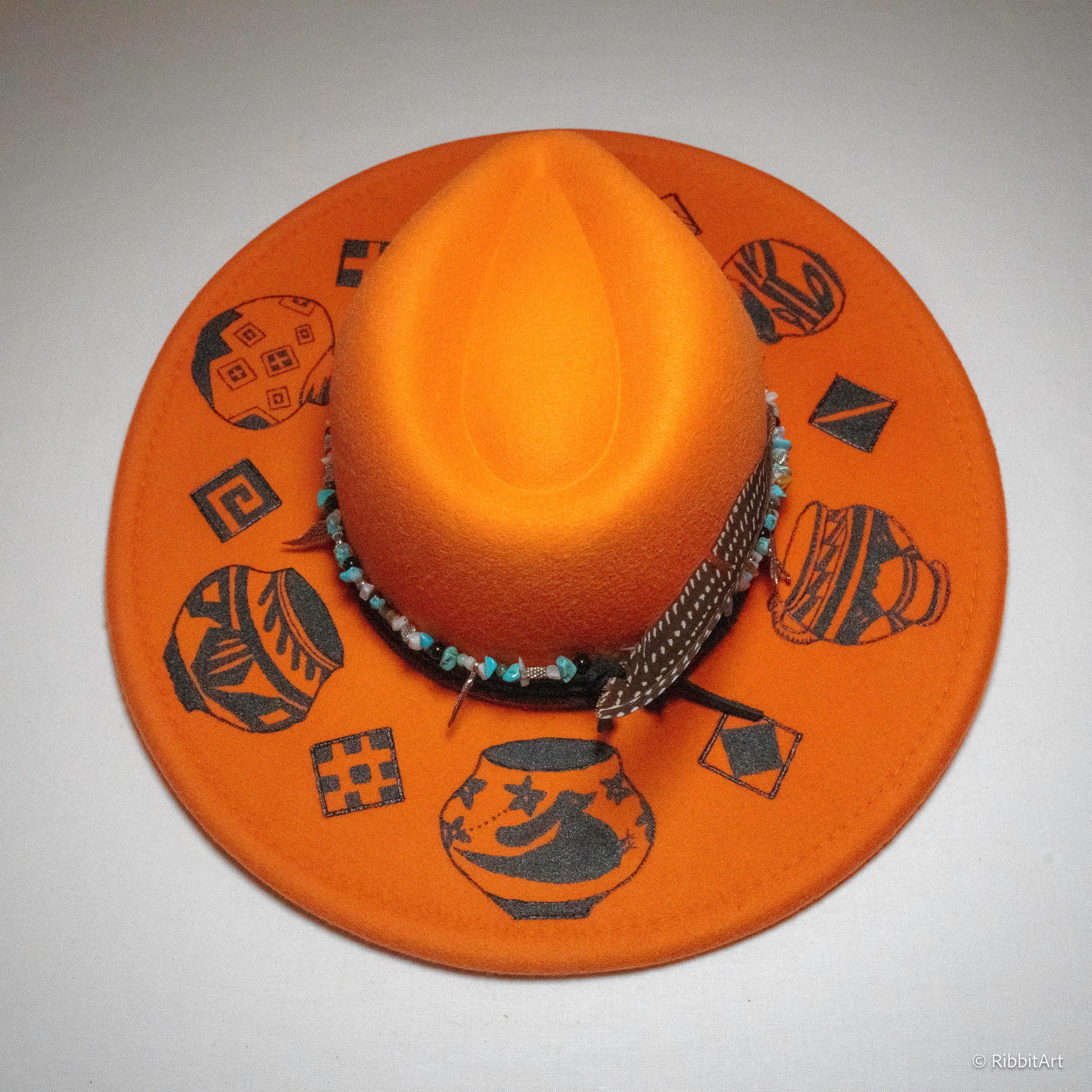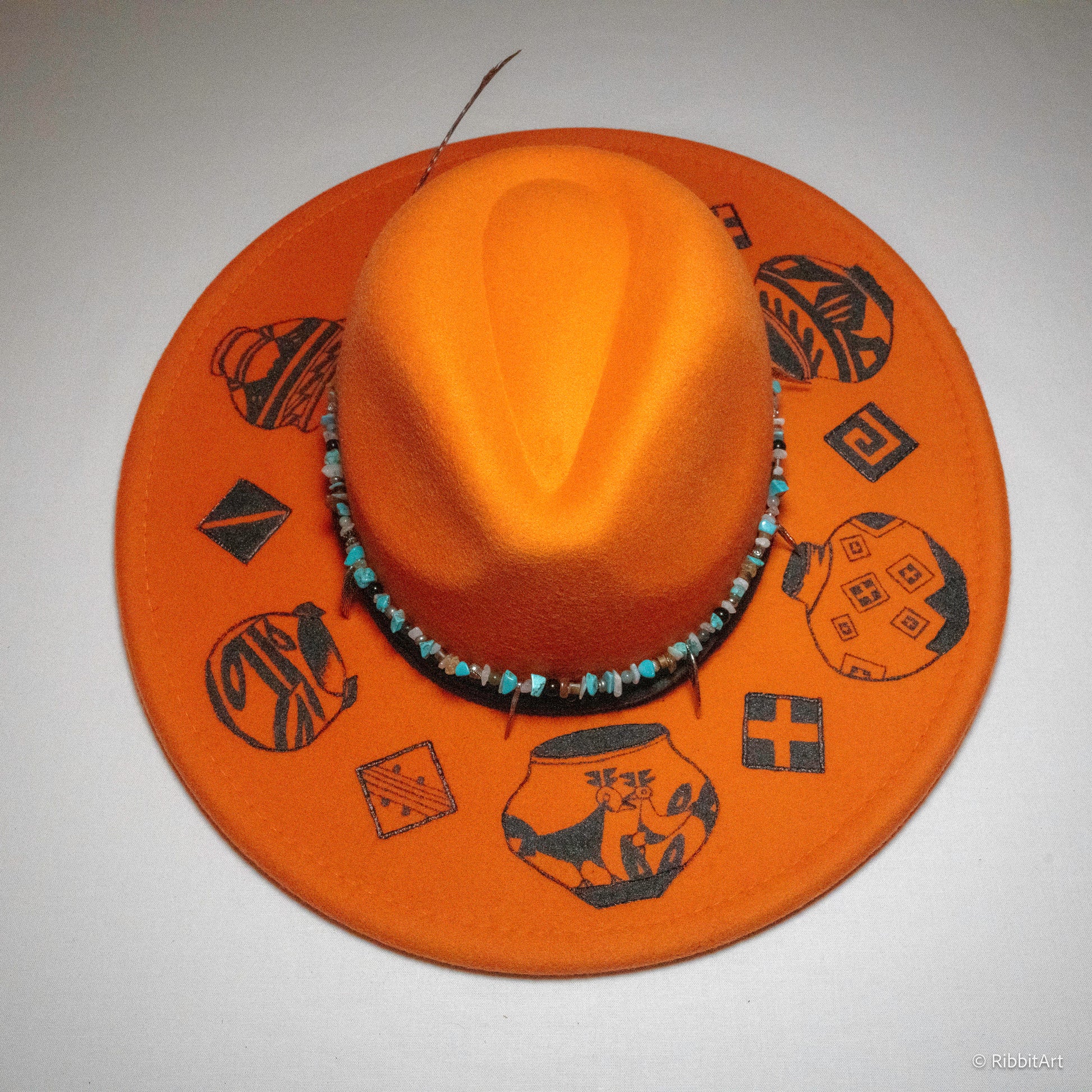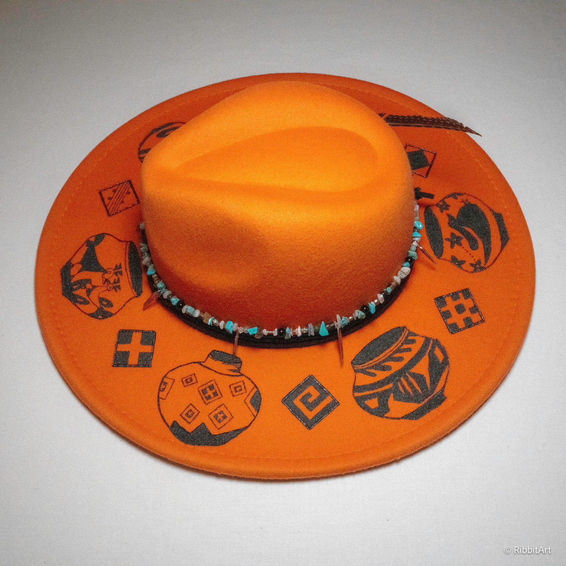 This rusty orange hat is burned & hand-painted with 19th-century Native American pots and adorned with a Pheasant feather, Turquoise, Moonstone, silver, Agate, and glass beads, feather & dragonfly charms.