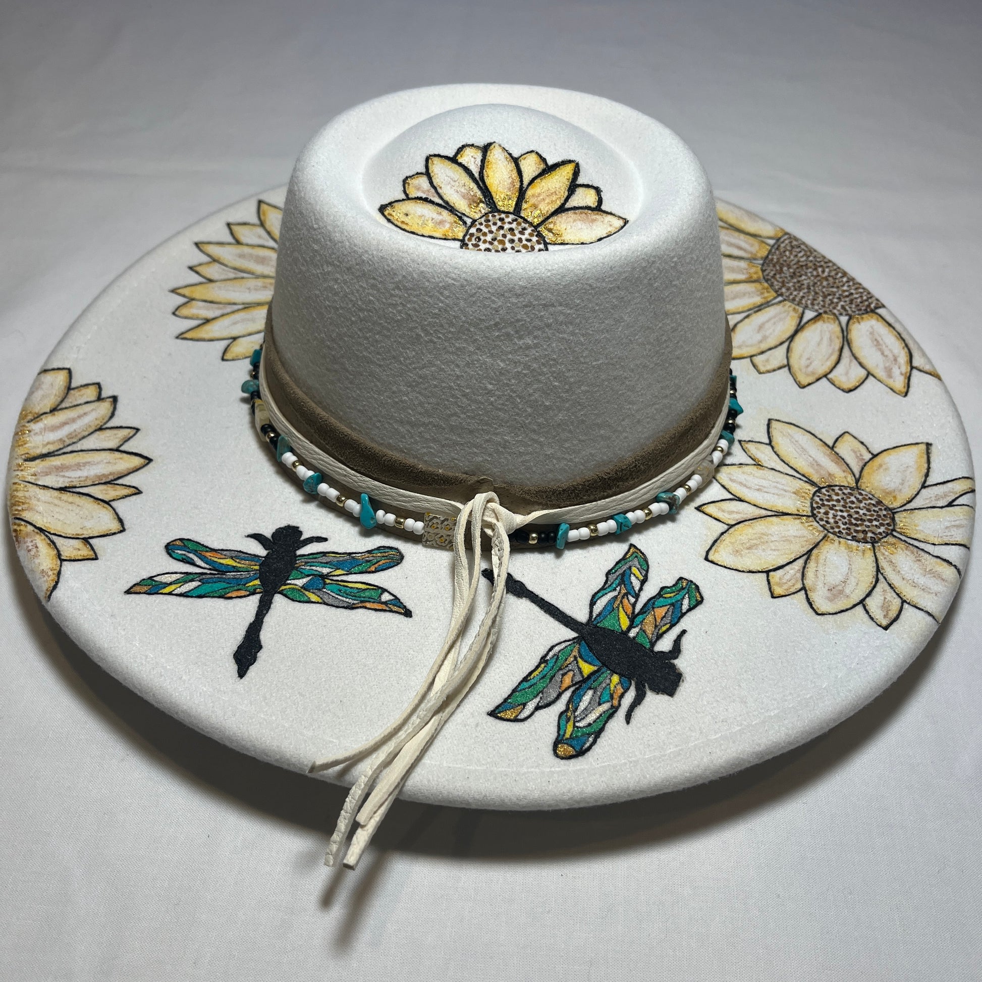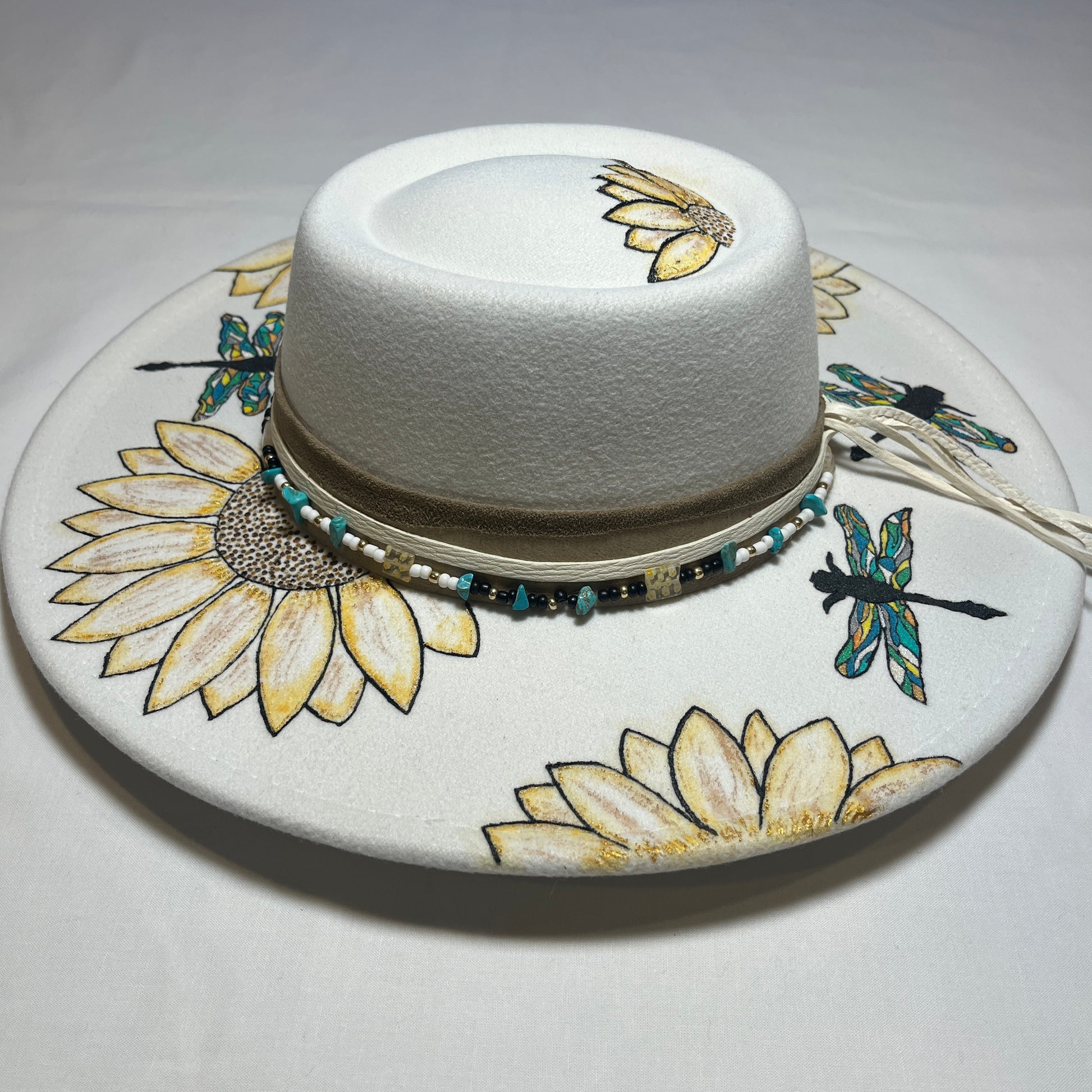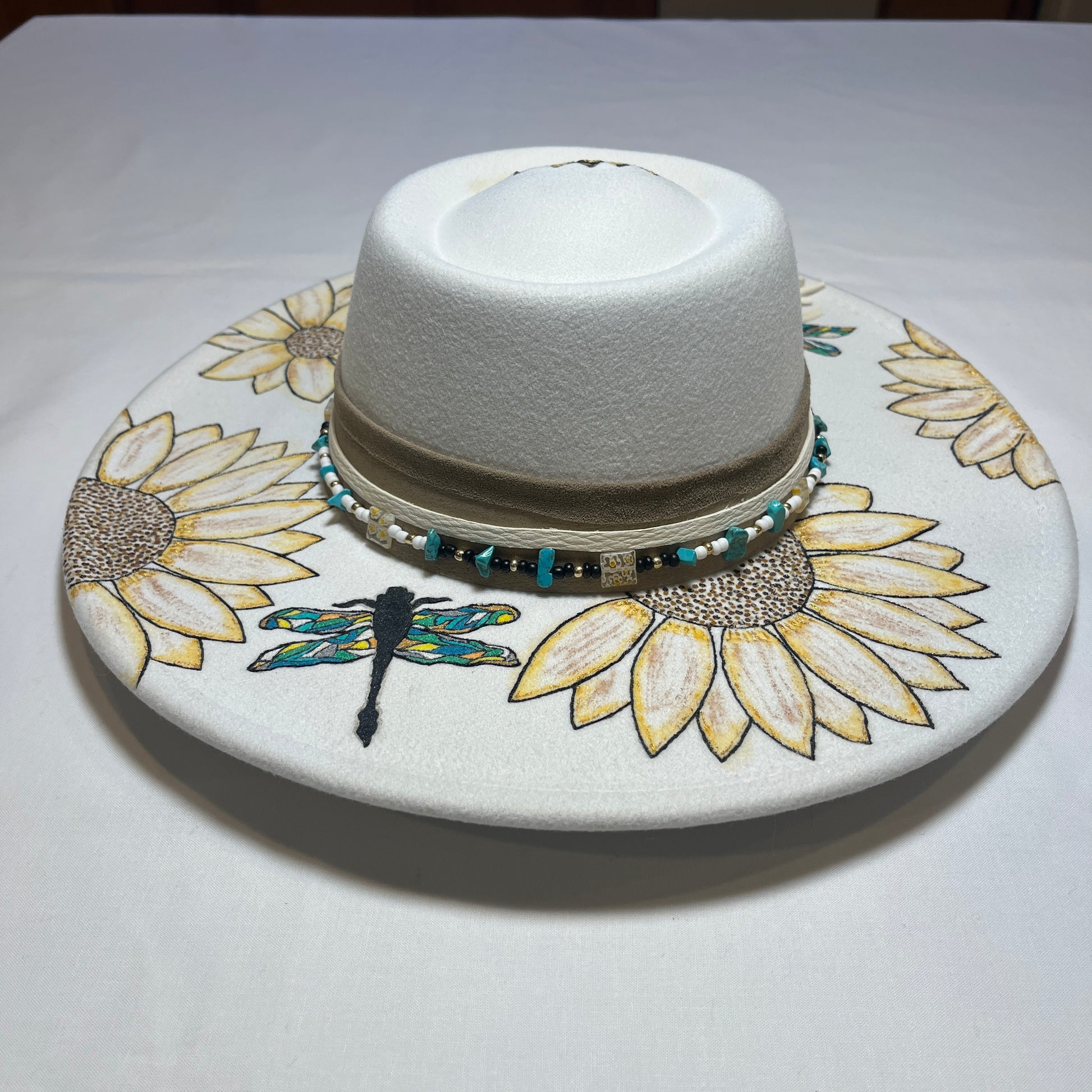 Burned and painted by hand. Hat band is leather with white, black, gold, turquoise and glass beads.