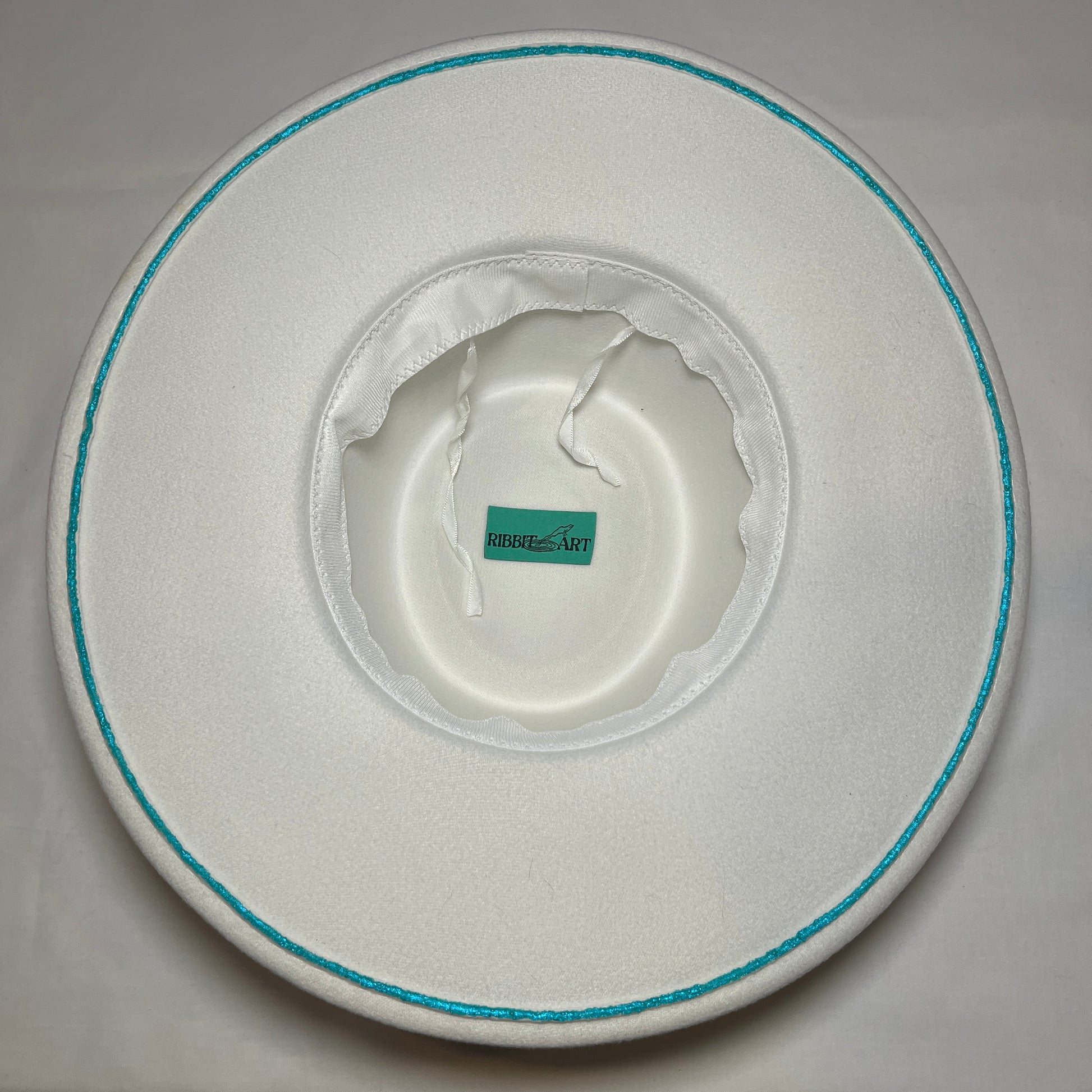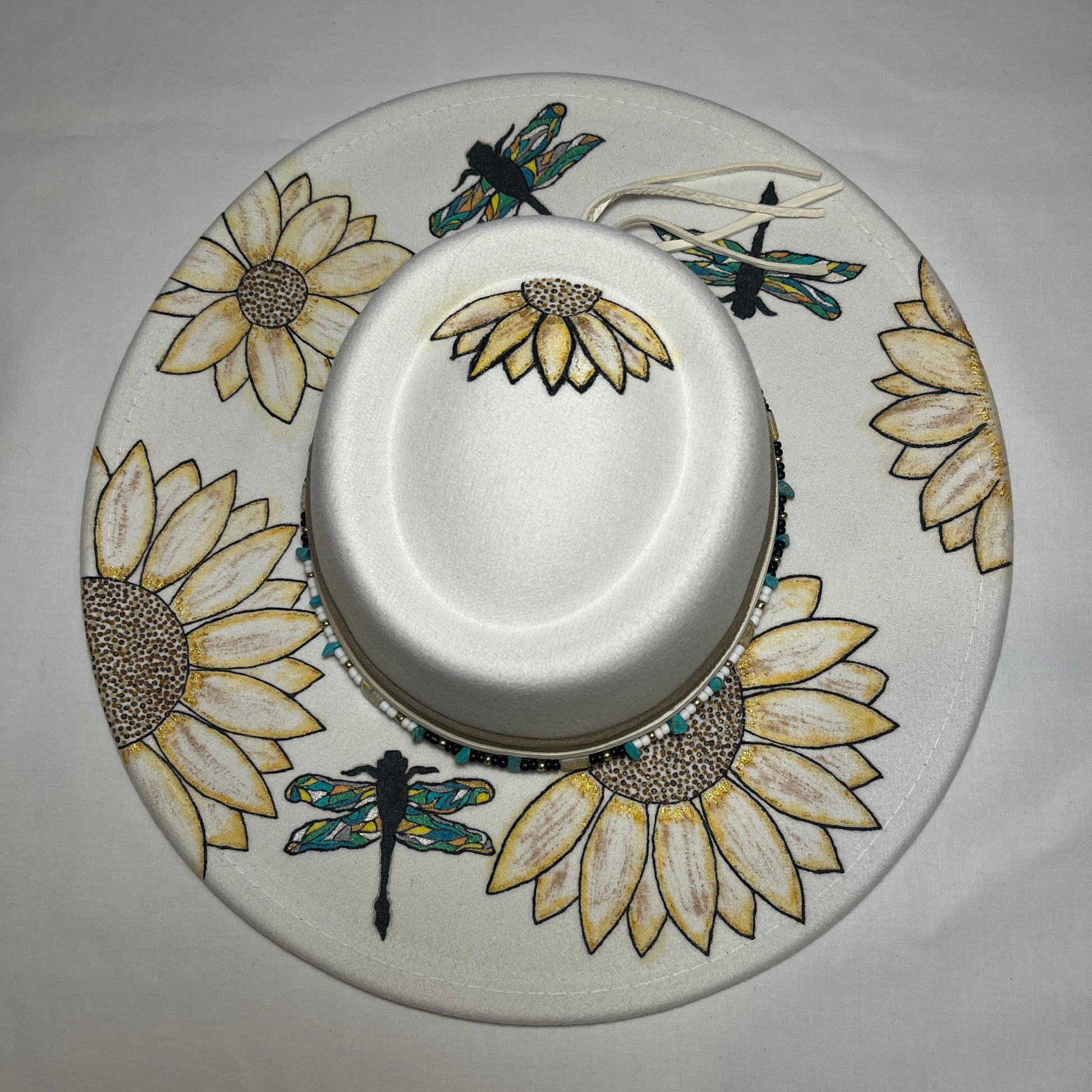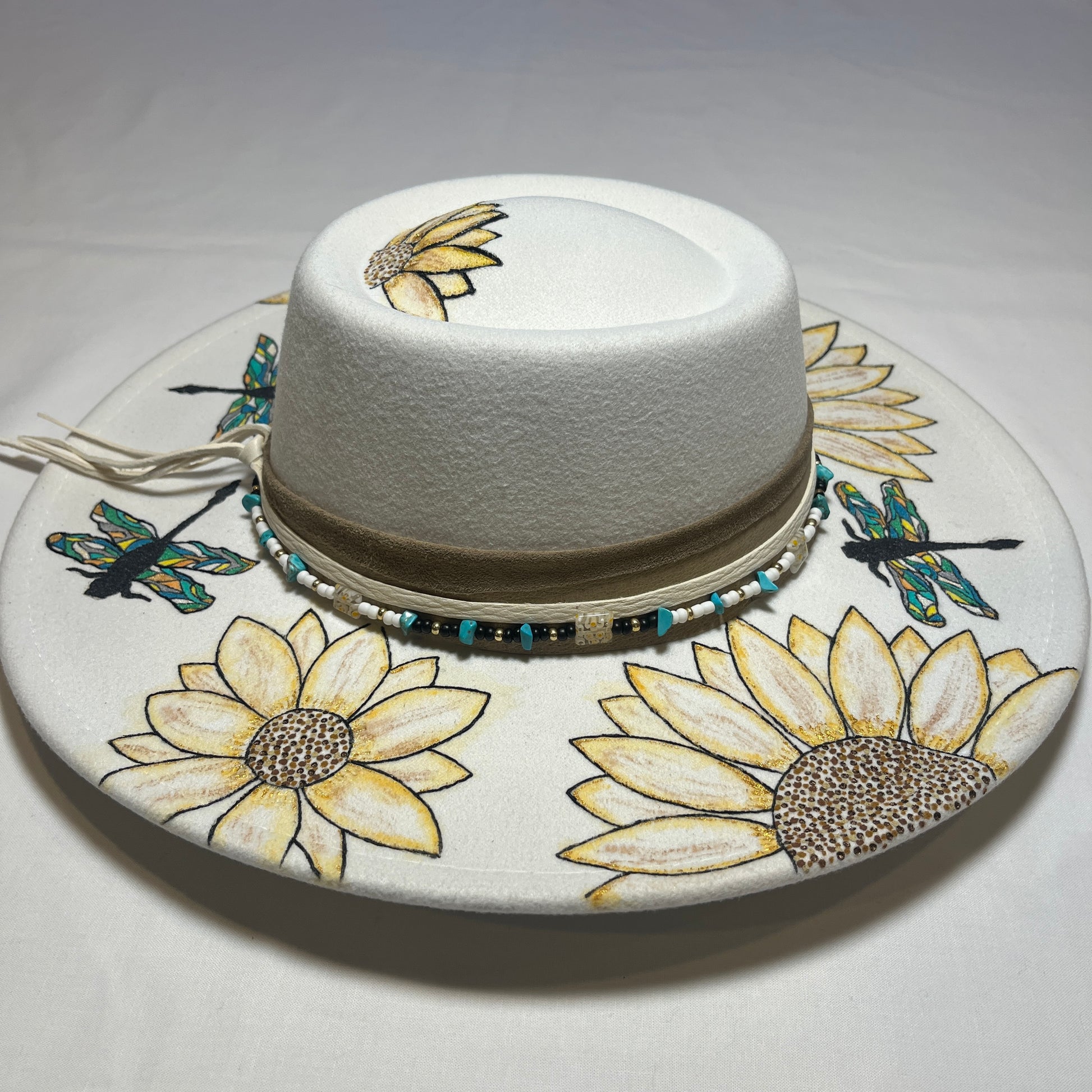 Burned and painted by hand. Hat band is leather with white, black, gold, turquoise and glass beads.
