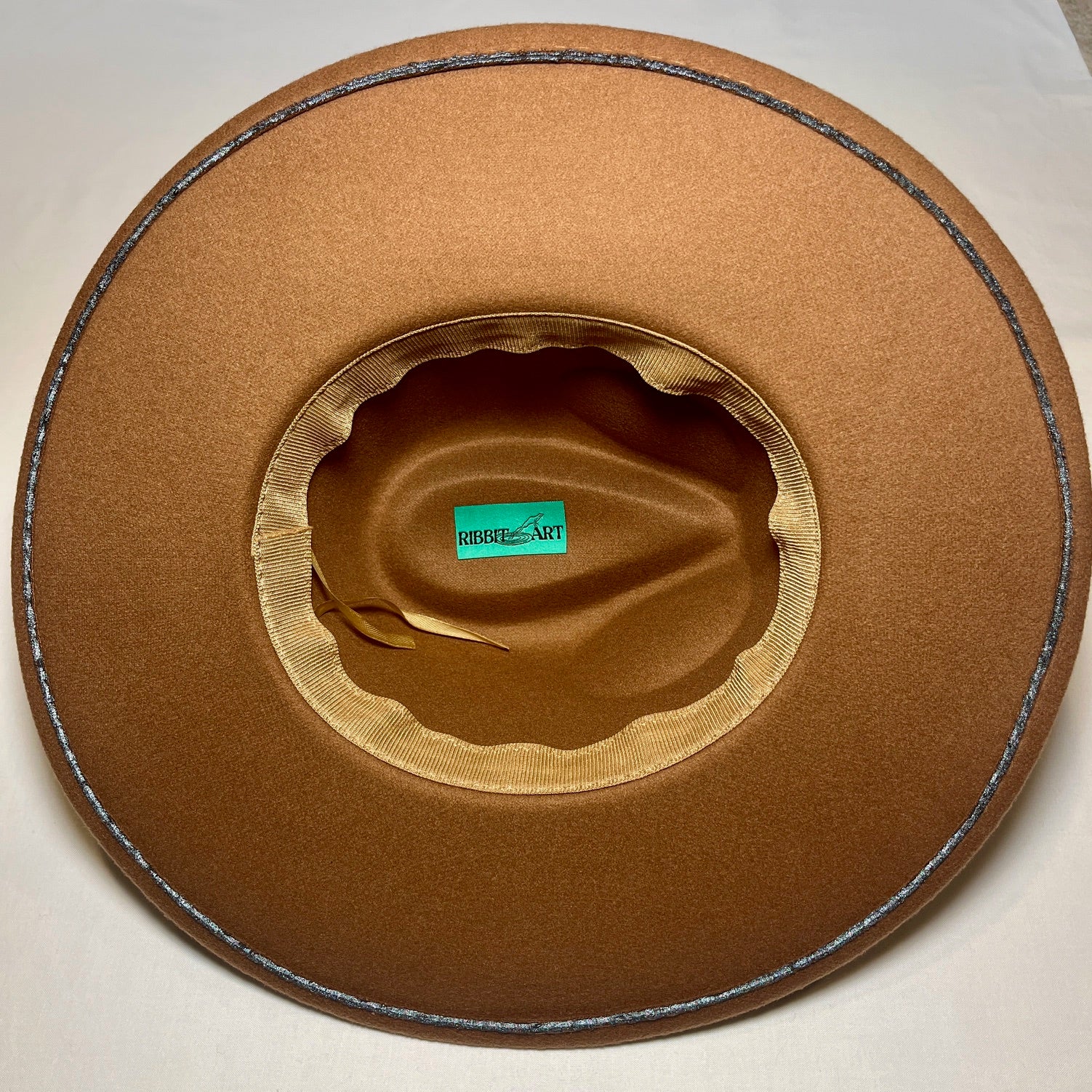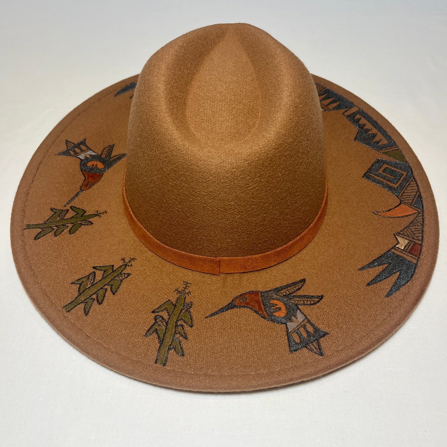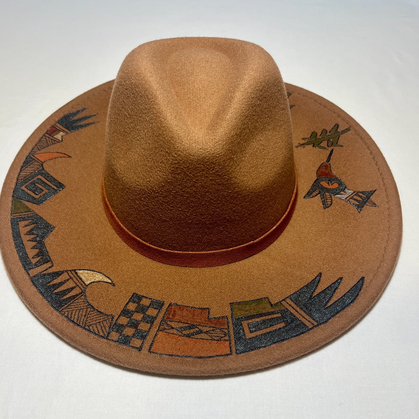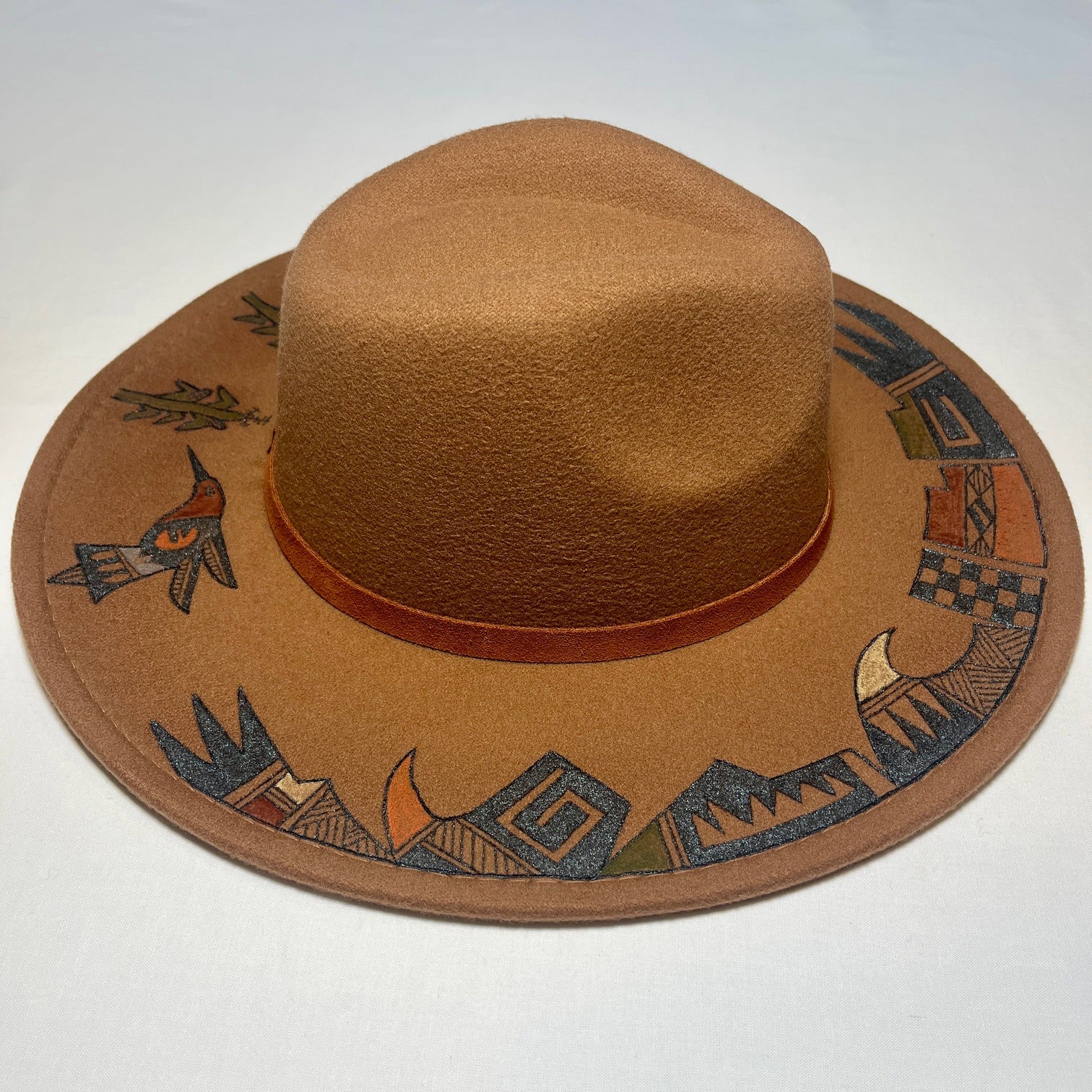 The Acoma Pueblo people inspire this hat. Burned and painted by hand. The hat band is leather.