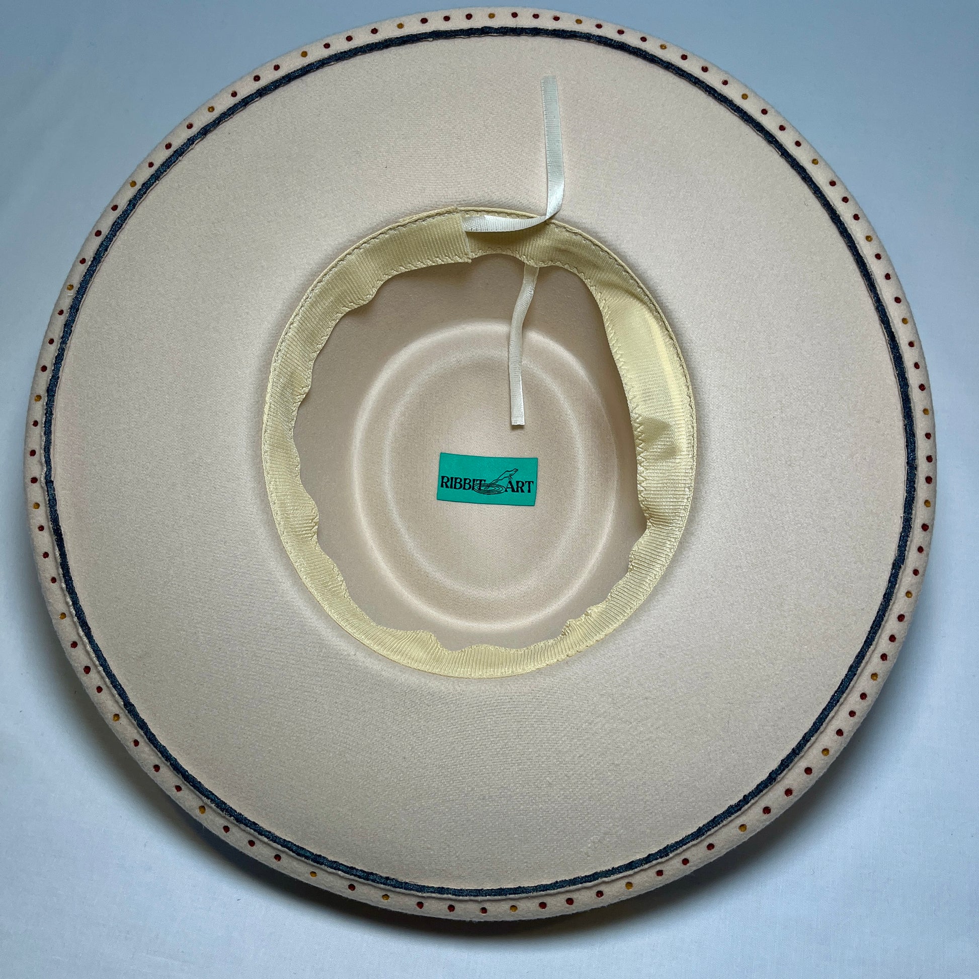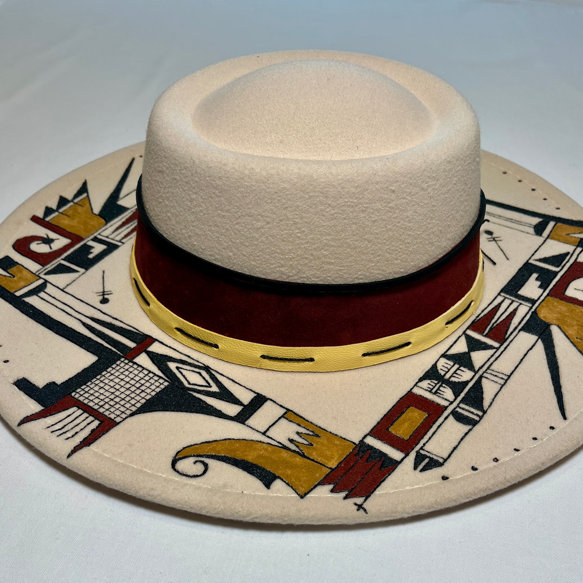 Cream colored, hand burned and painted. This hat was inspired by a Hopi pot. Abstract in design. Band is leather and fiber.