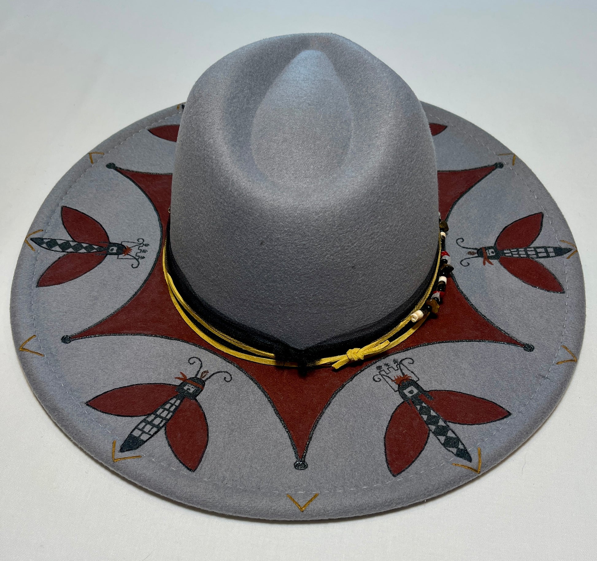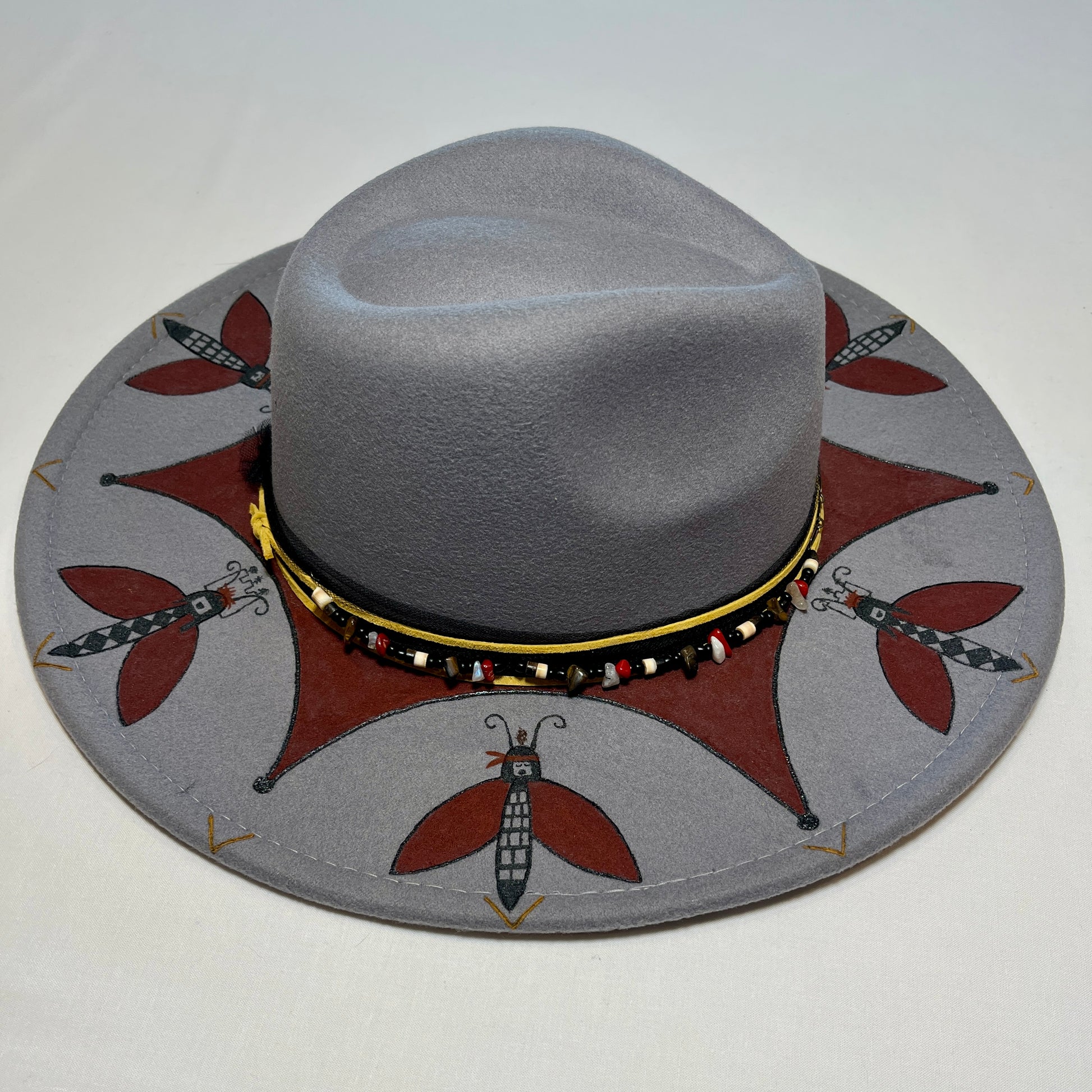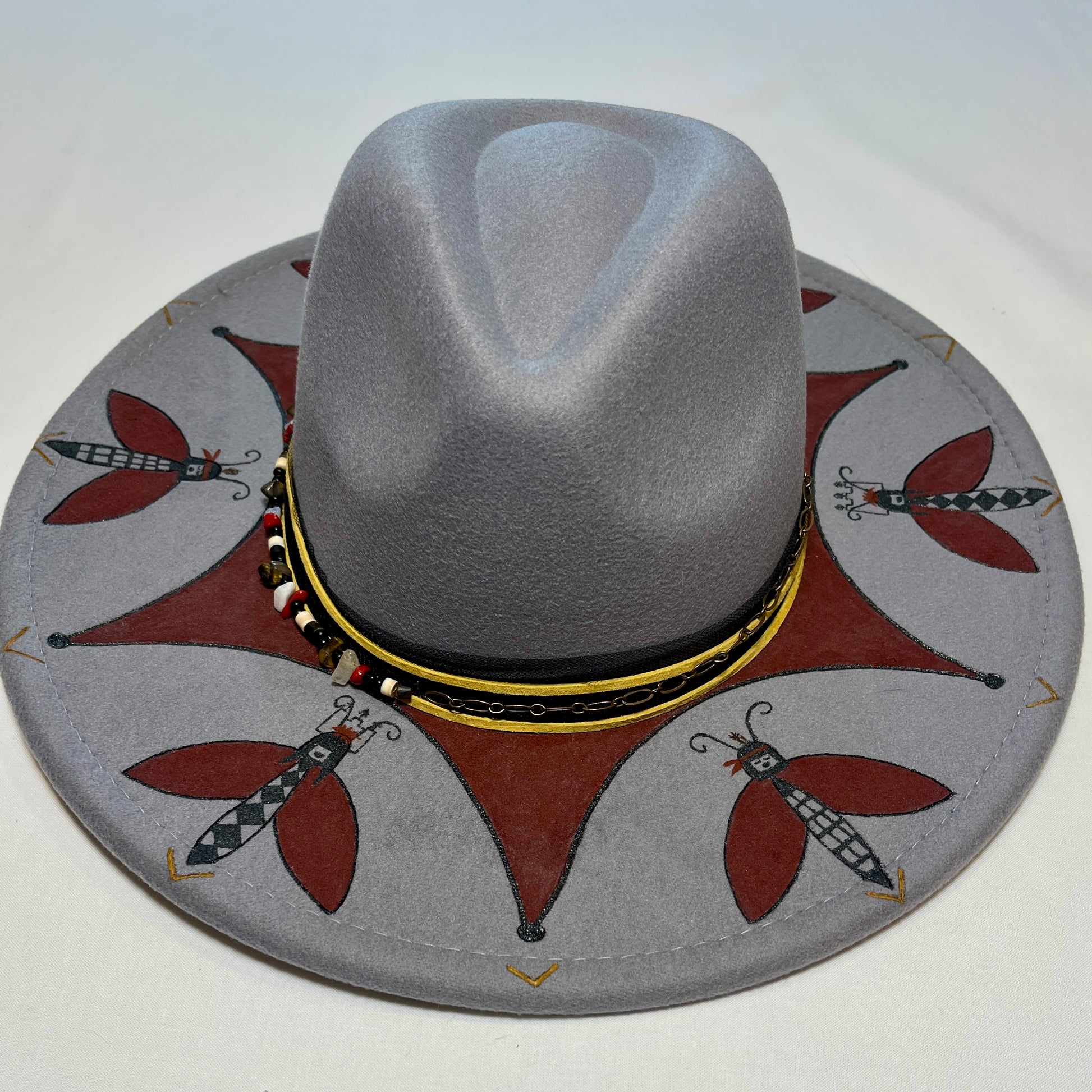 Grey Hat, burned and hand painted (Burnt Sienna) with Native American butterfly images. Band has natural stones of Moonstone, Tiger Eye, glass and leather.