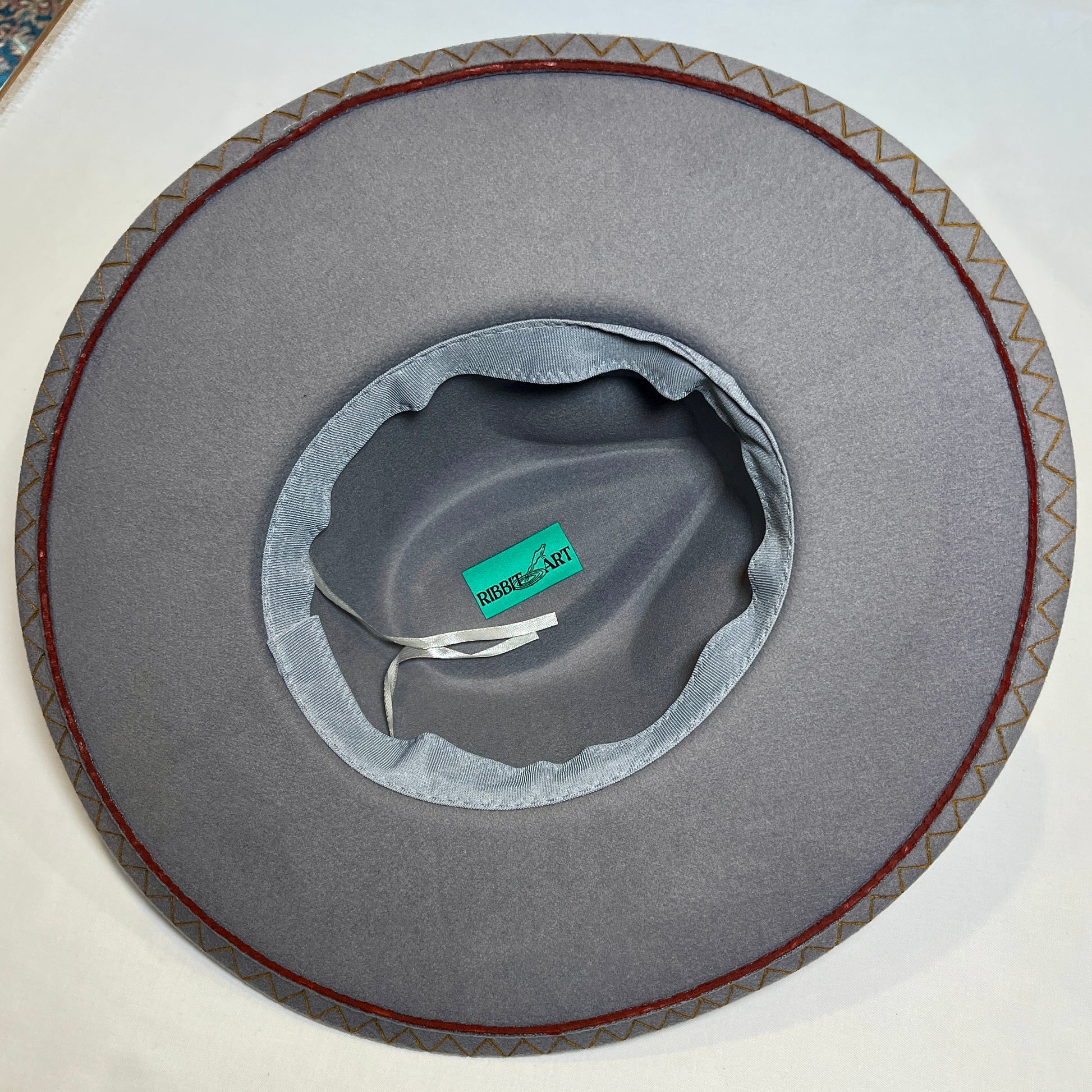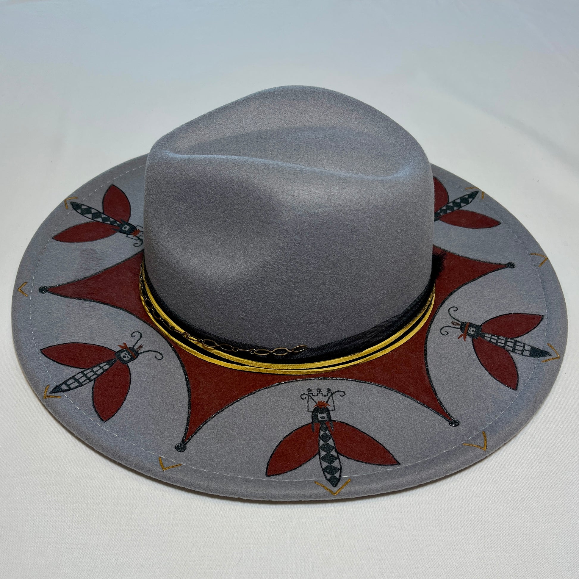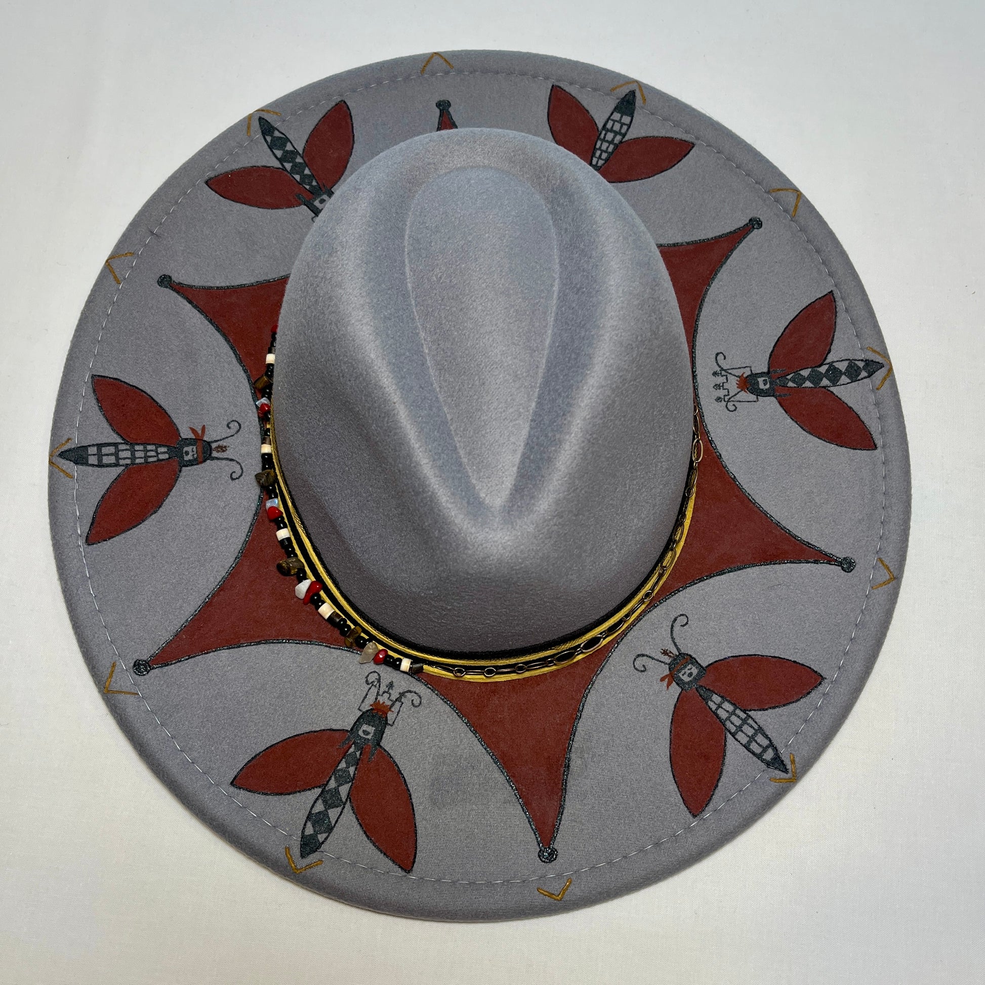 Grey Hat, burned and hand painted (Burnt Sienna) with Native American butterfly images. Band has natural stones of Moonstone, Tiger Eye, glass and leather.