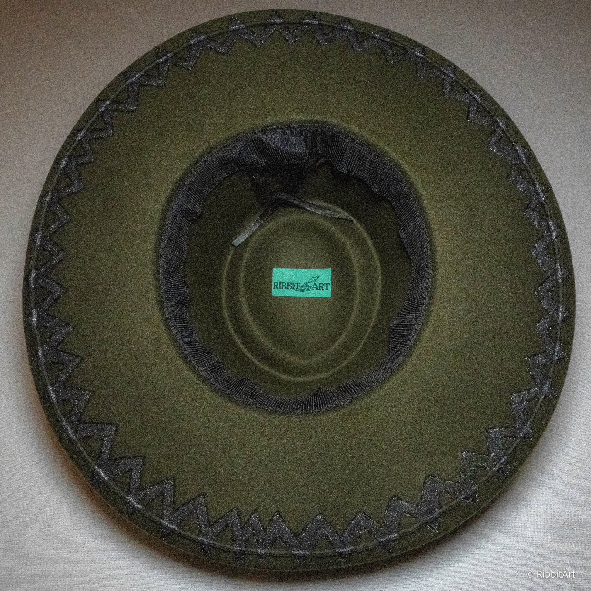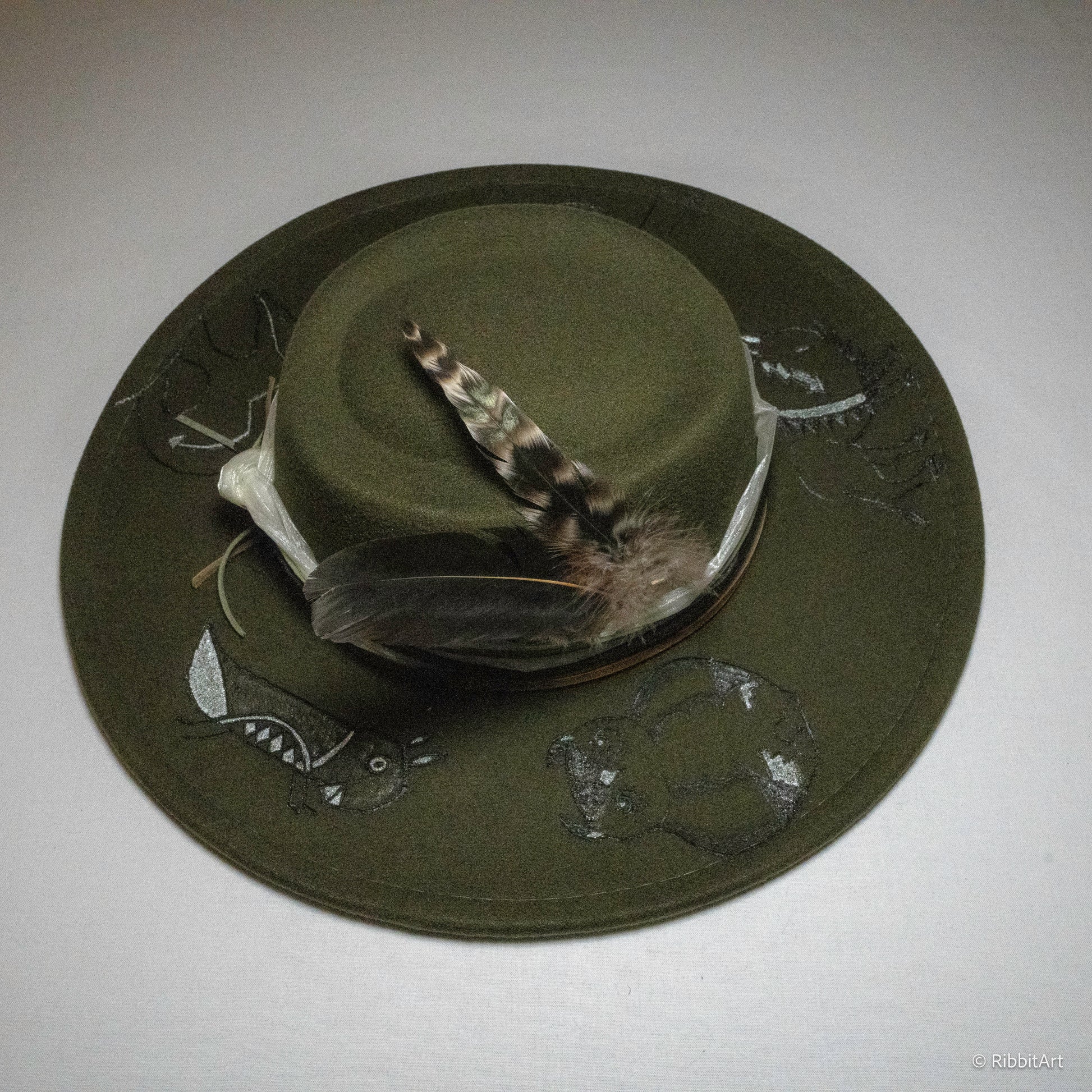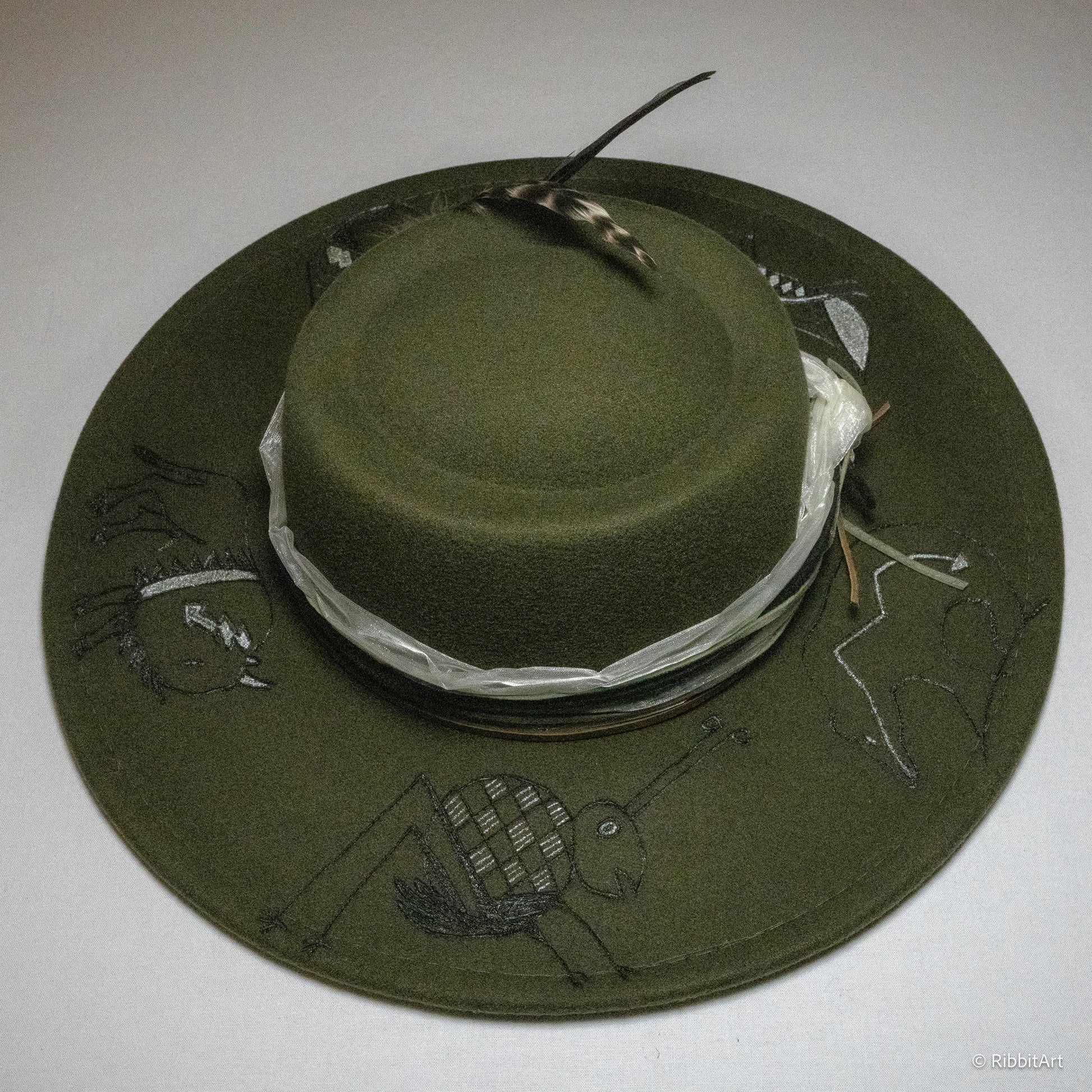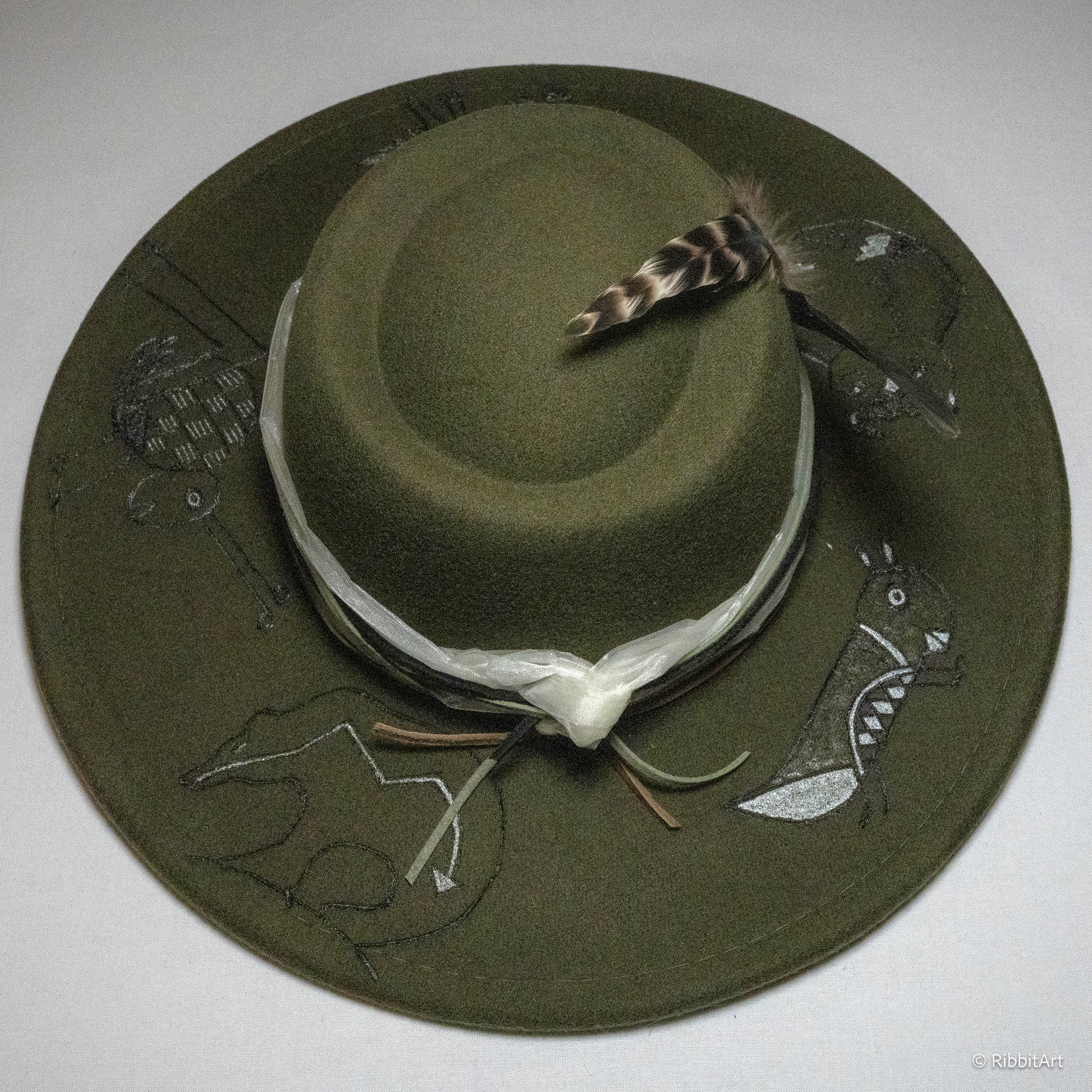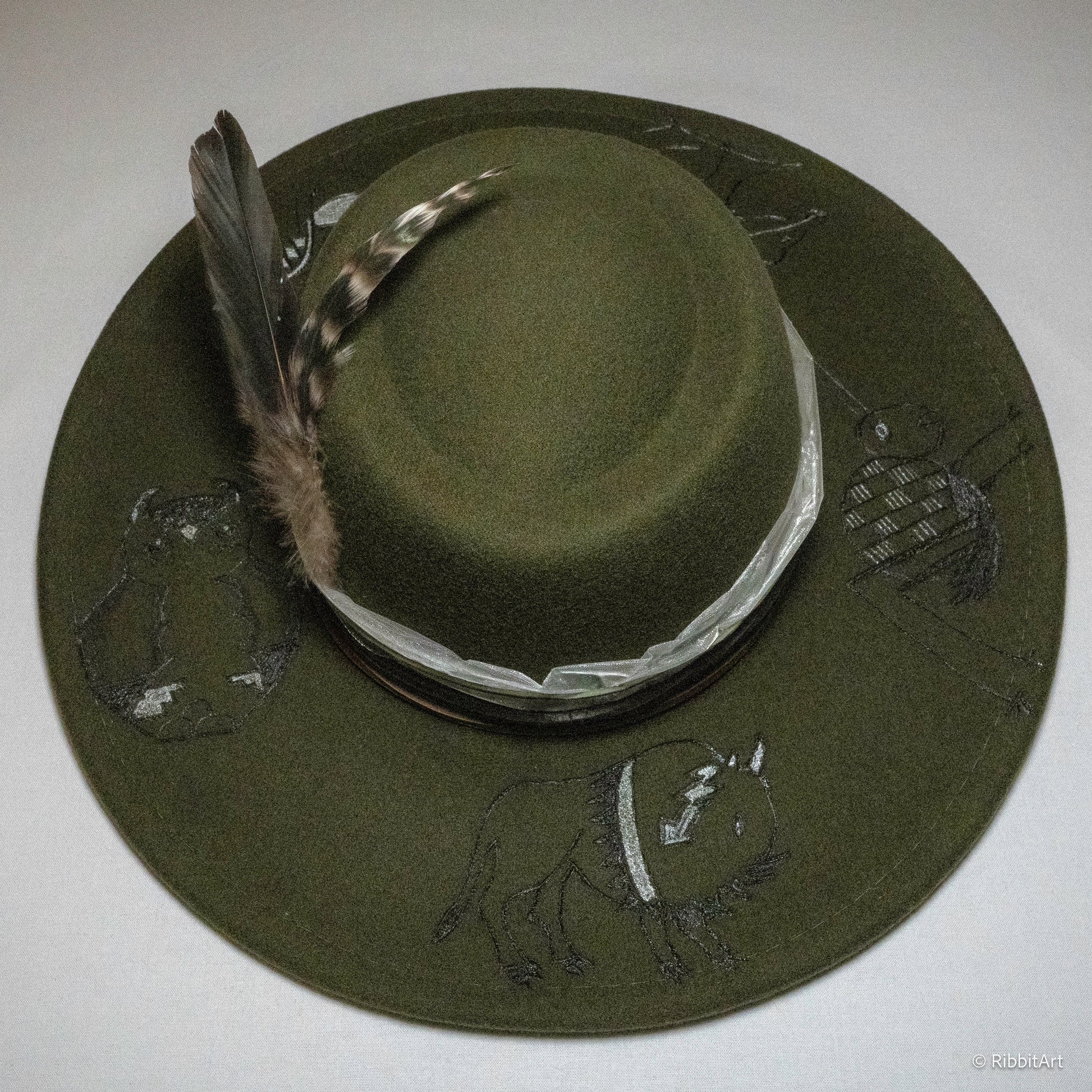 A beautiful dark green hat is burned & hand-painted with Ancient Native American designs and adorned with Pheasant & Turkey feathers.