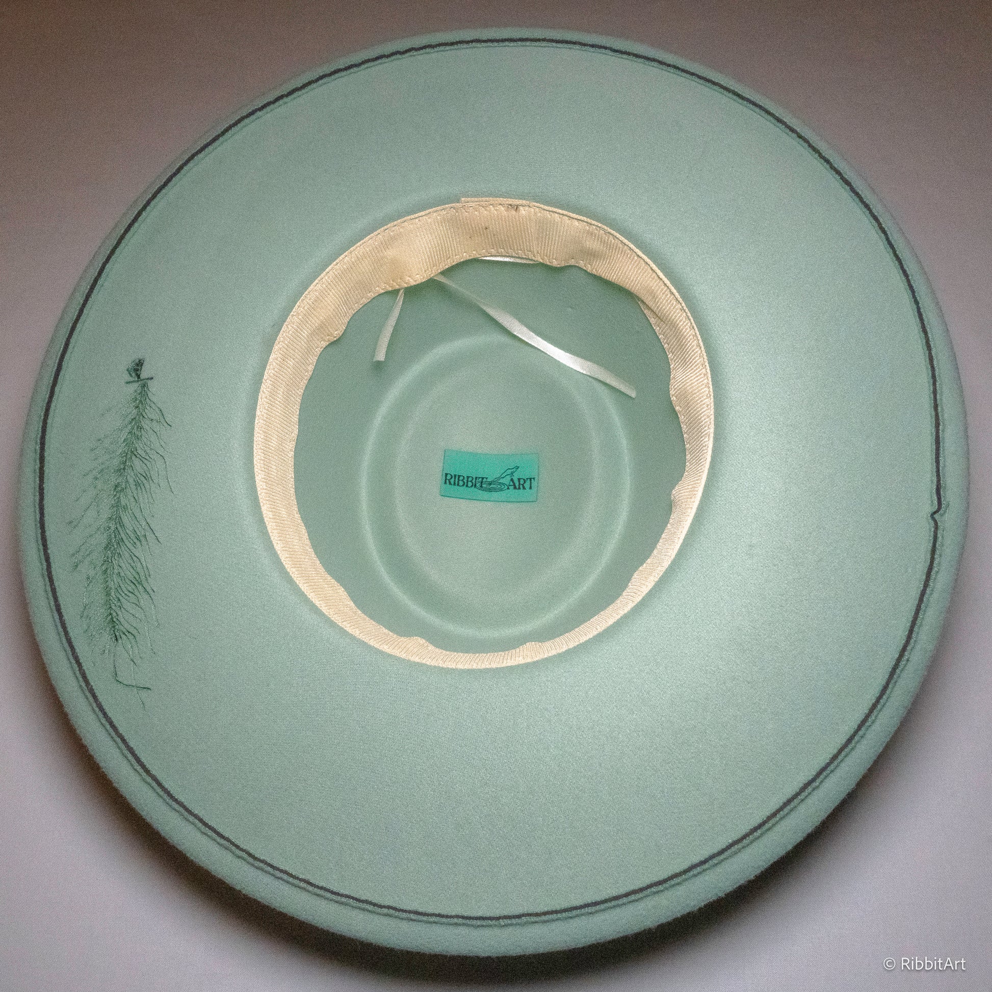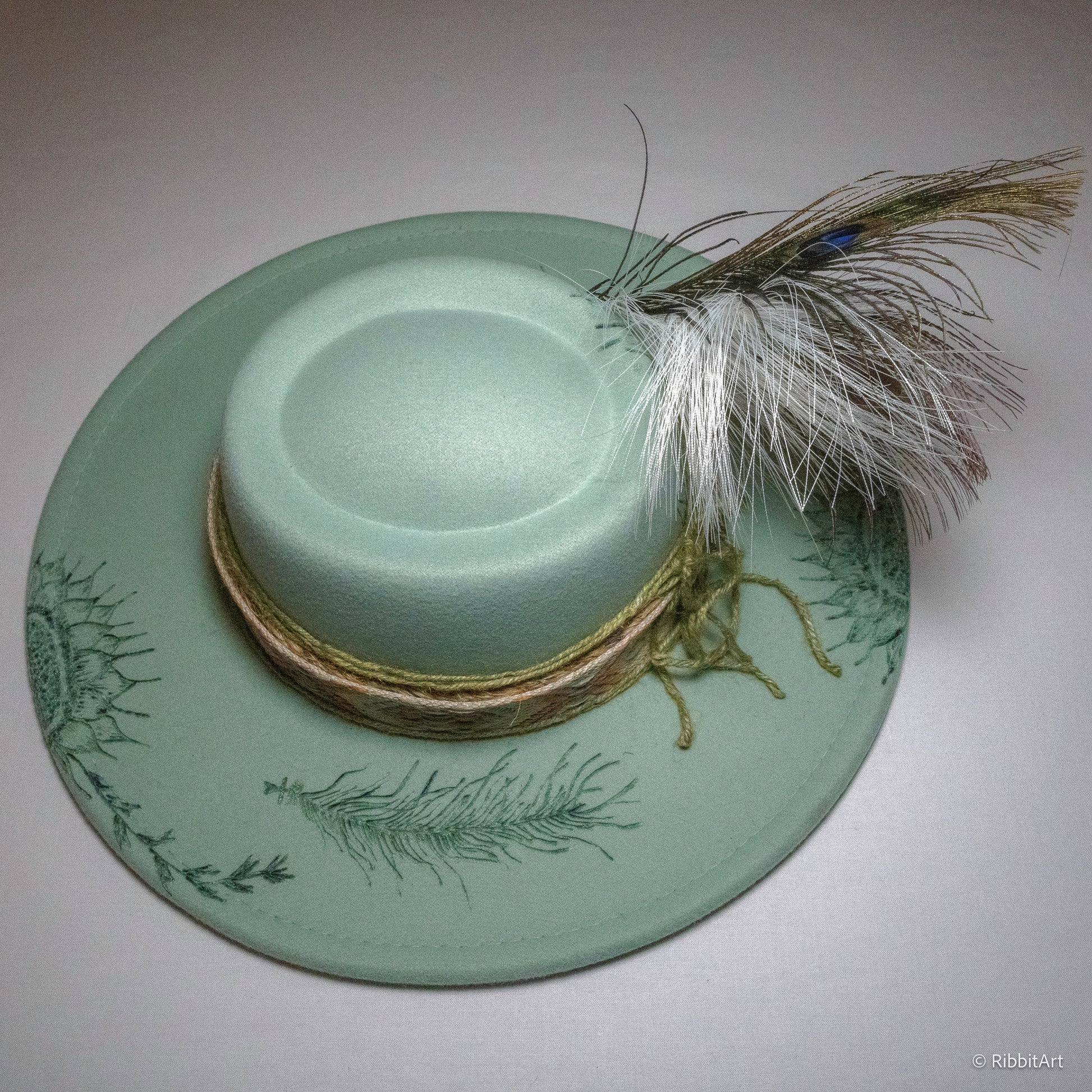 Minty Green with burned feathers & flowers. Peacock Feathers add to its beauty and simplicity. Hat size is adjustable