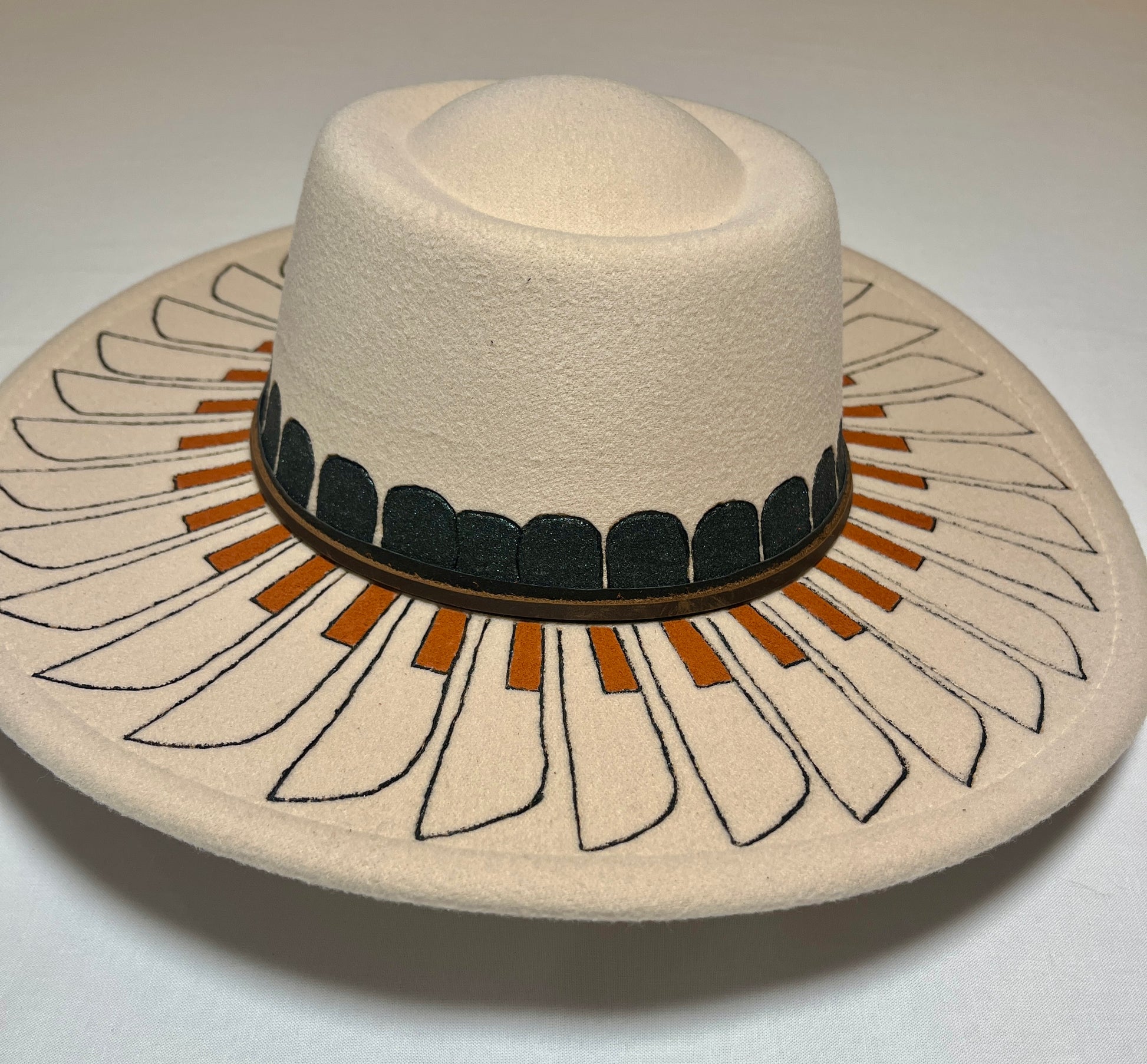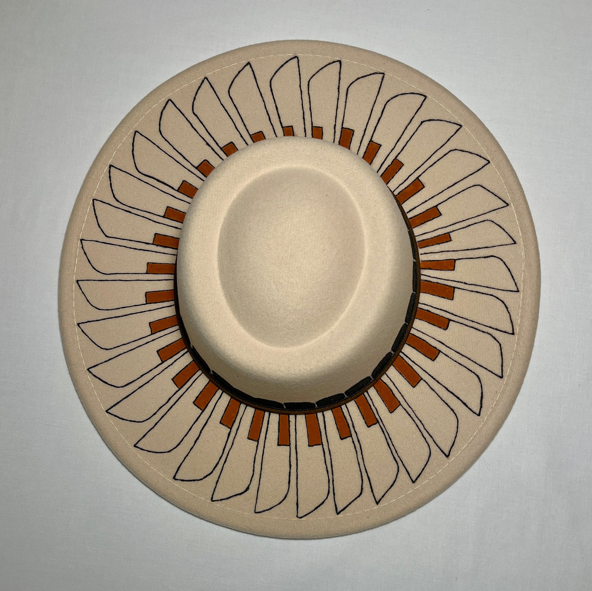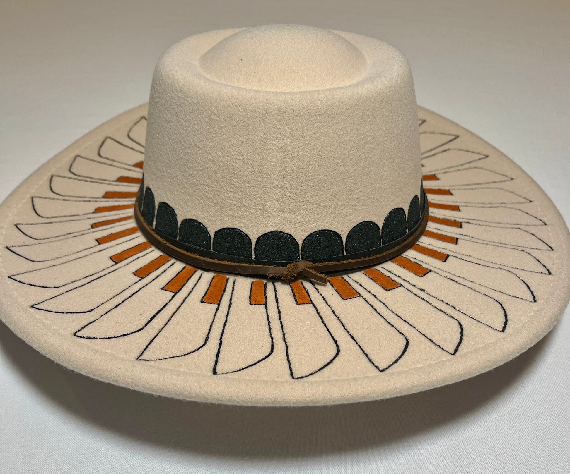 Cream color burned and hand painted repeat feather design inspired by the Native American Pueblo, along with other tribes. Band is leather