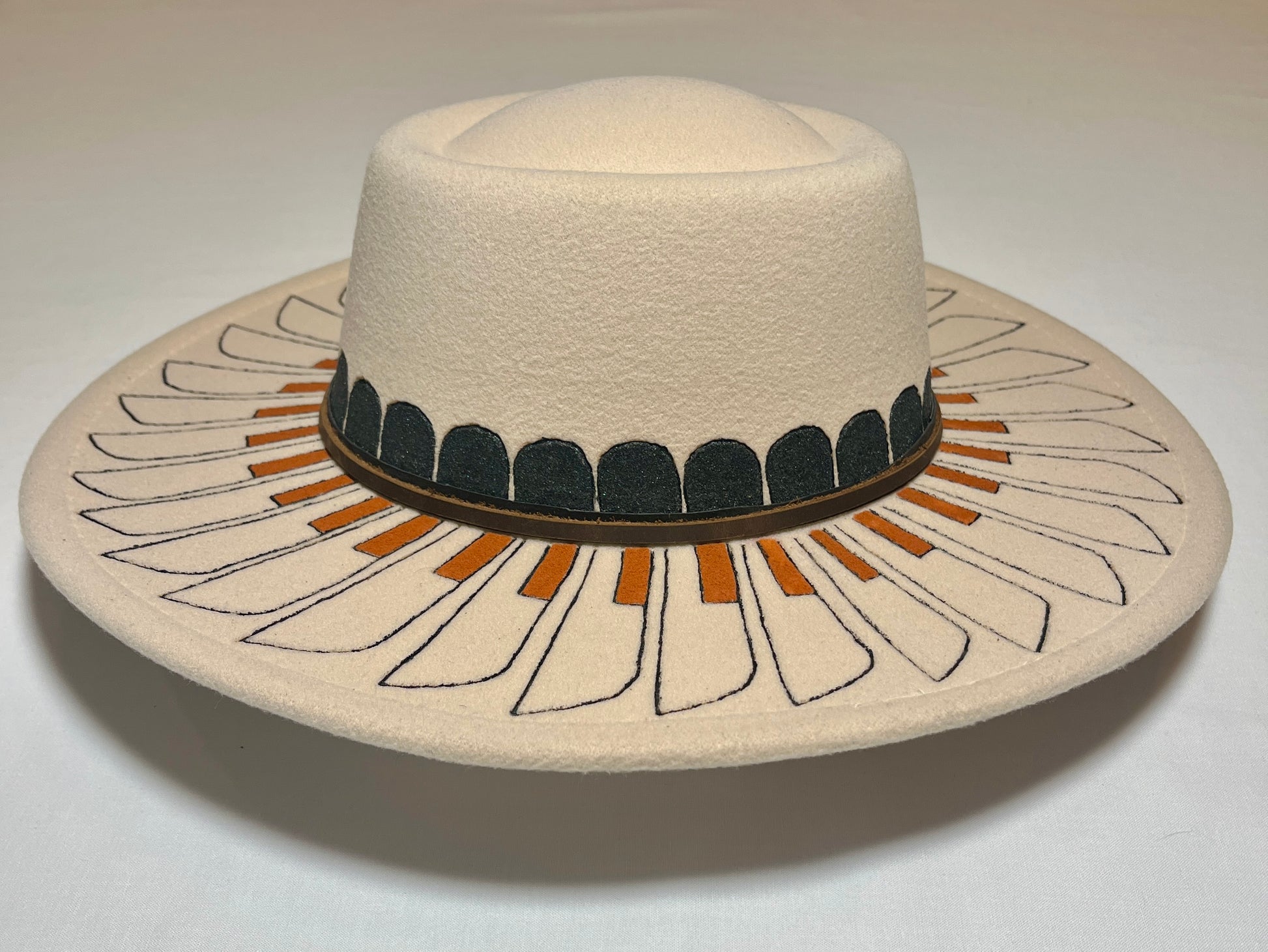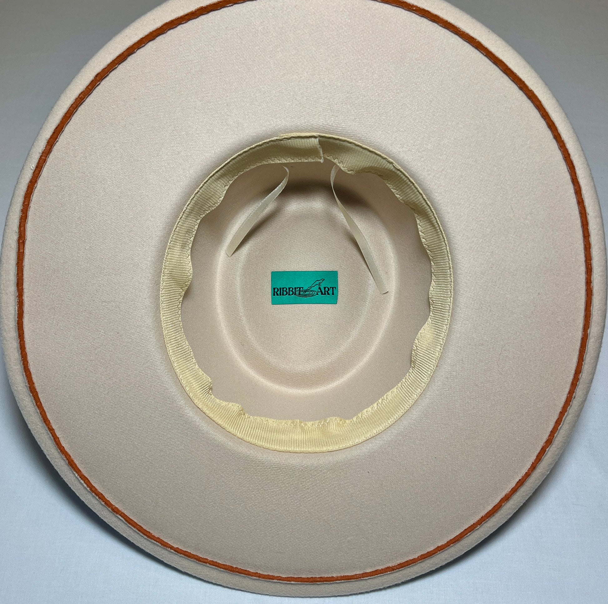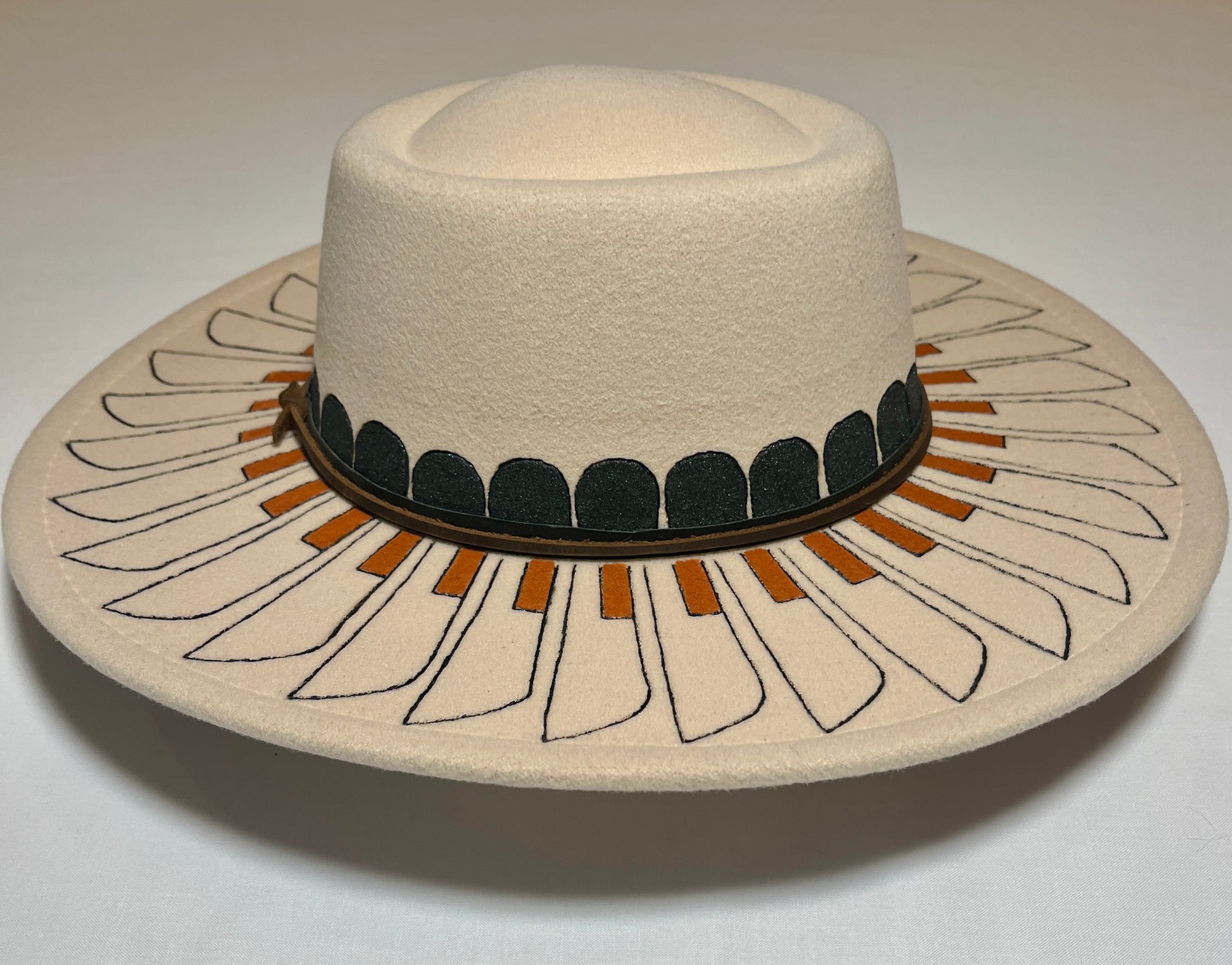 Cream color burned and hand painted repeat feather design inspired by the Native American Pueblo, along with other tribes. Band is leather